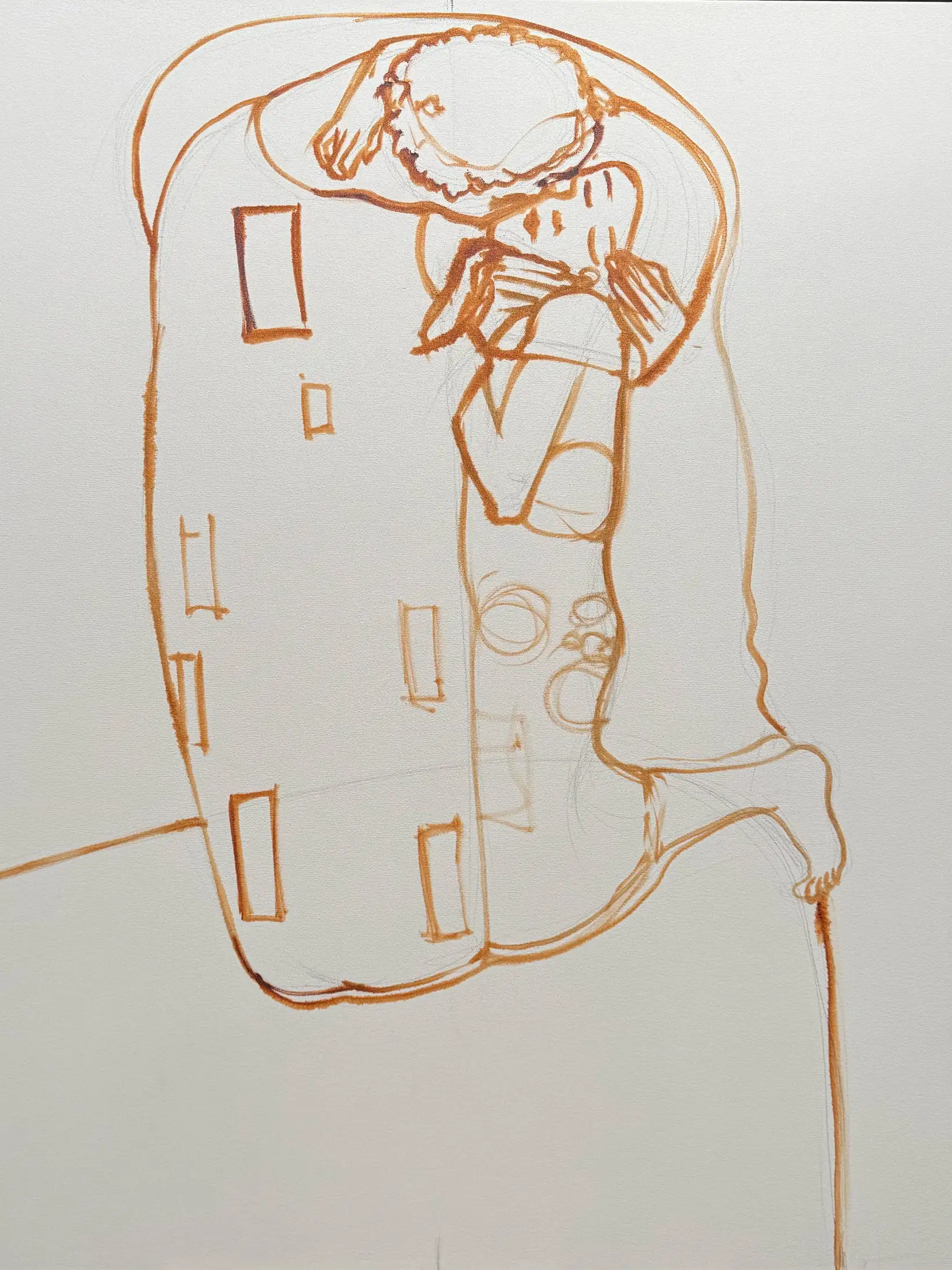 КРАСКИ: Умбра жженая, умбра ленинградская натуральная, охра желтая, английская красная, кобальт средний синий, белила титановые, кадмий желтый светлый, кадмий красный светлый, марс черный, краплак розовый.
