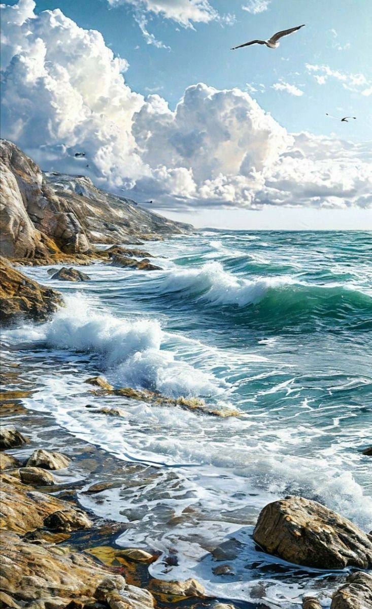 3 слой: Детализация. Научитесь прорисовывать облака, прорисовывать волны и камни. градиентами.
