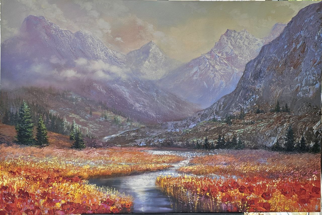 Краски: Белила титановые, кадмий лимонный, кадмий желтый средний, кадмий желтый средний, кадмий красный светлый, охра желтая, индийская желтая, турецкая голубая, королевская голубая, фиолетово-розовый хинакридон, марс оранжевый, индиго,голубая фц, зеленая фц.